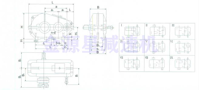 (5) 減速器有九種傳動比,九種配置形式和三種低速軸軸端形式。